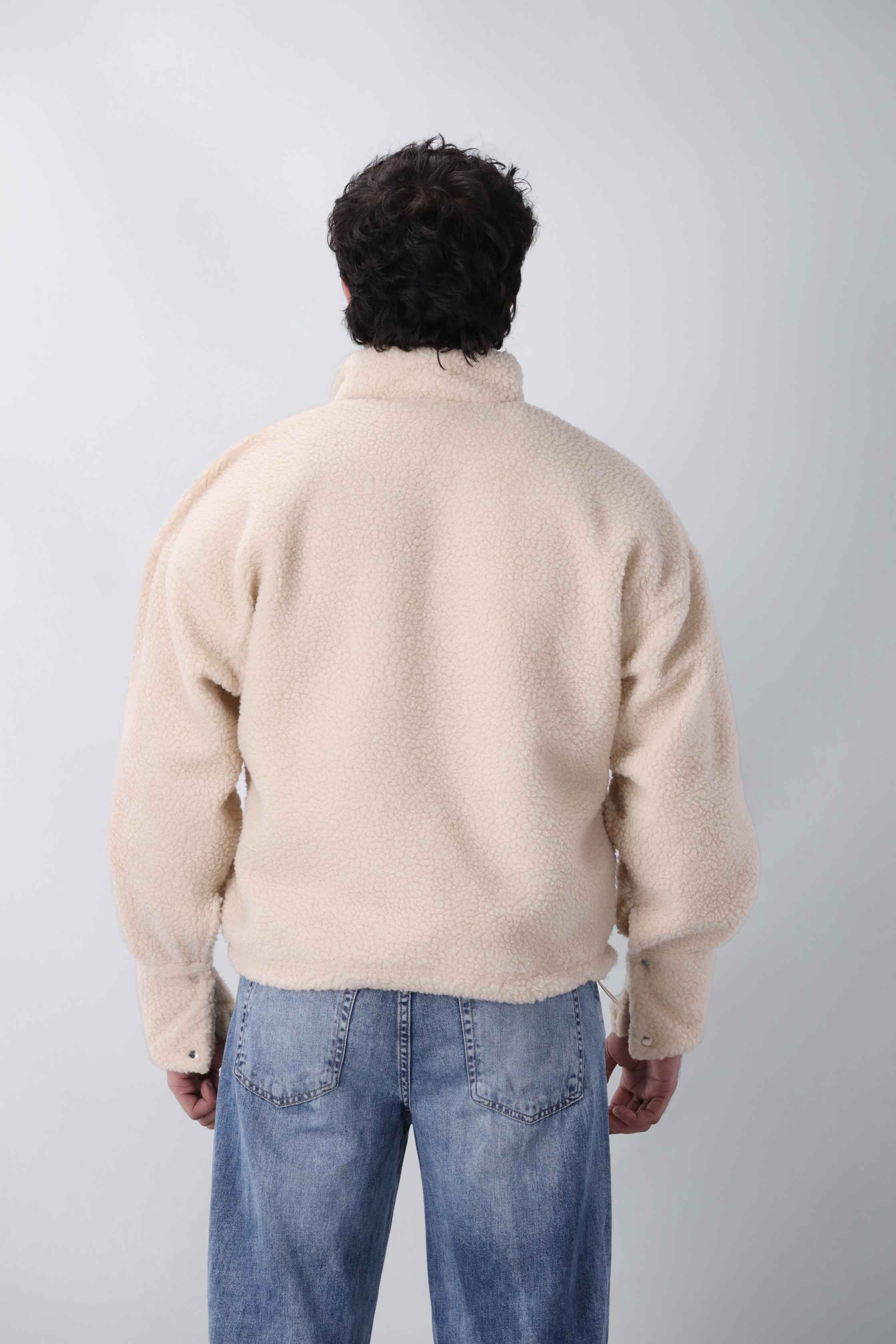 The back remains smooth and uninterrupted, allowing the depth and texture of the sherpa fabric to take focus. The adjustable hem provides controlled shaping from the rear, ensuring both comfort and structure in the overall silhouette.