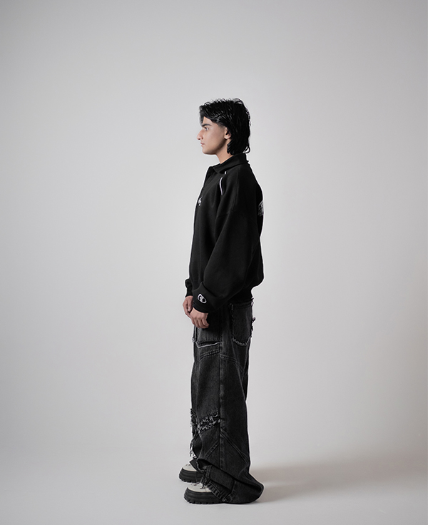 •Front Design: A cotton striped knit collar with a cut forming a V-notch shape, shoulder panels accented with contrast piping, and The Fallen Angel embroidery for a bold and unique touch.