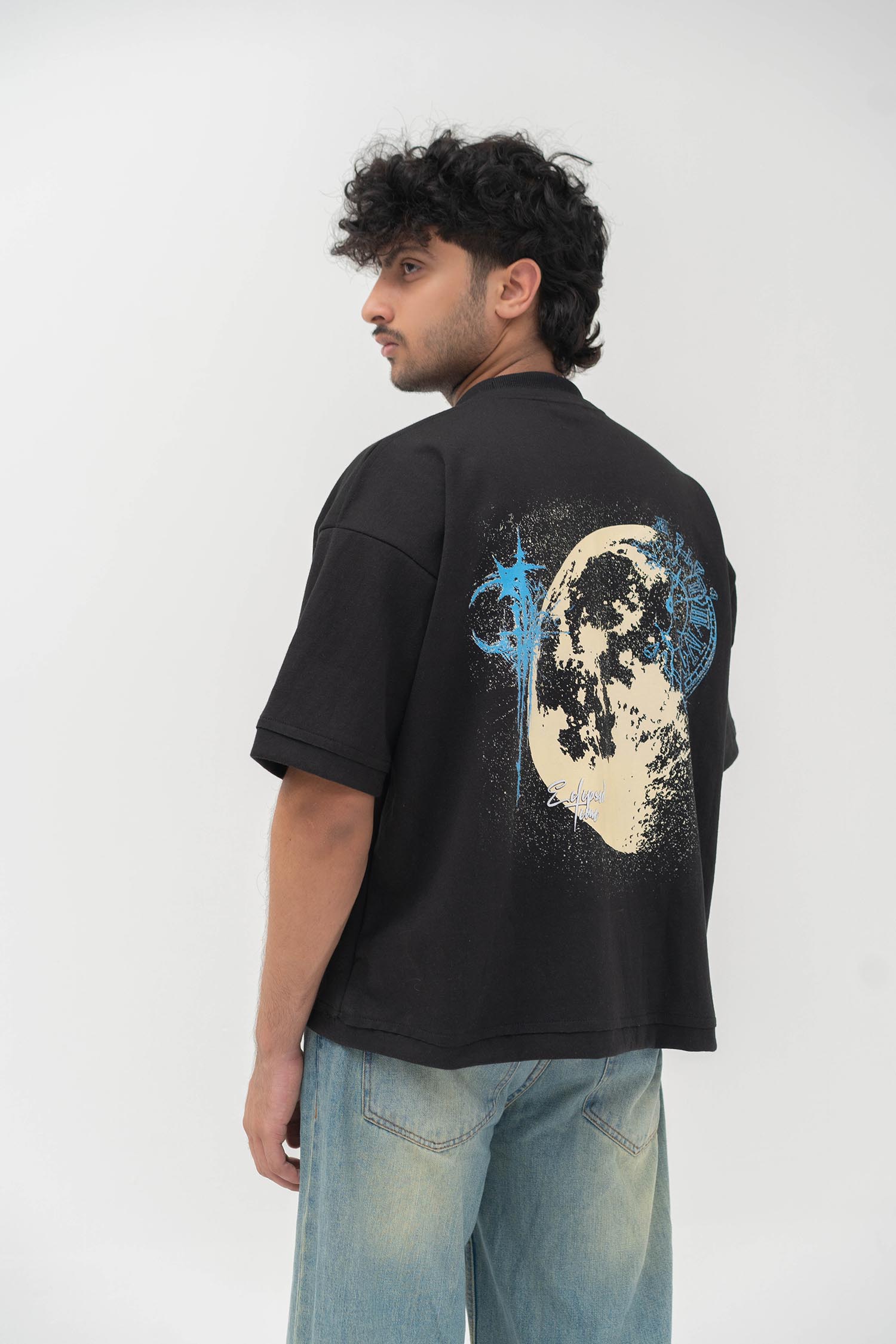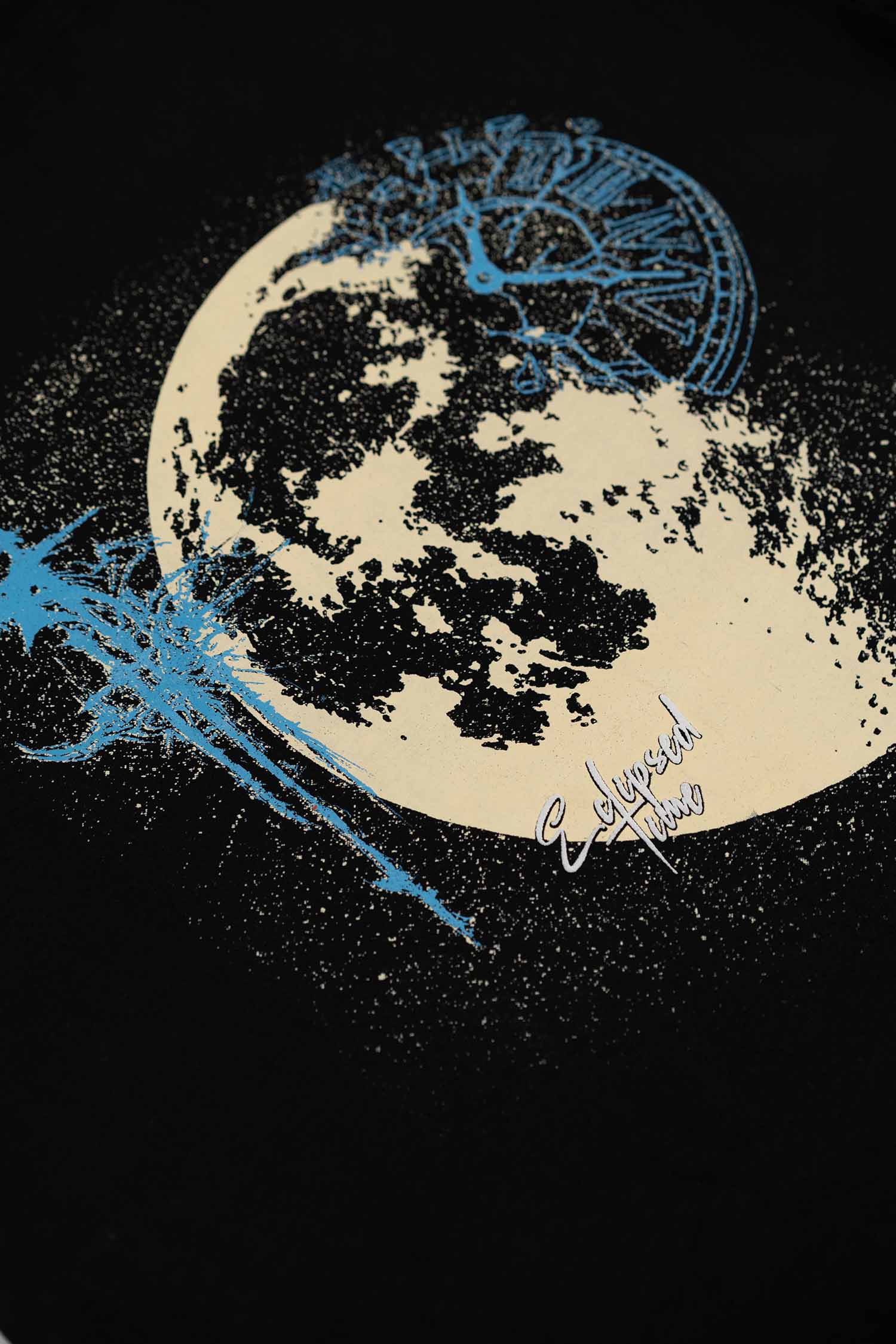 The story continues on the right side with a half-broken watch in the same sky blue and skin sparkles, mirroring the front. At the center, a faded half-moon in skin tone takes focus, overlaid with the article title "Eclipsed Time" in white puff print. The left side features additional sky blue elements and skin-colored sparkles, completing the visual balance and cosmic feel of the design.
