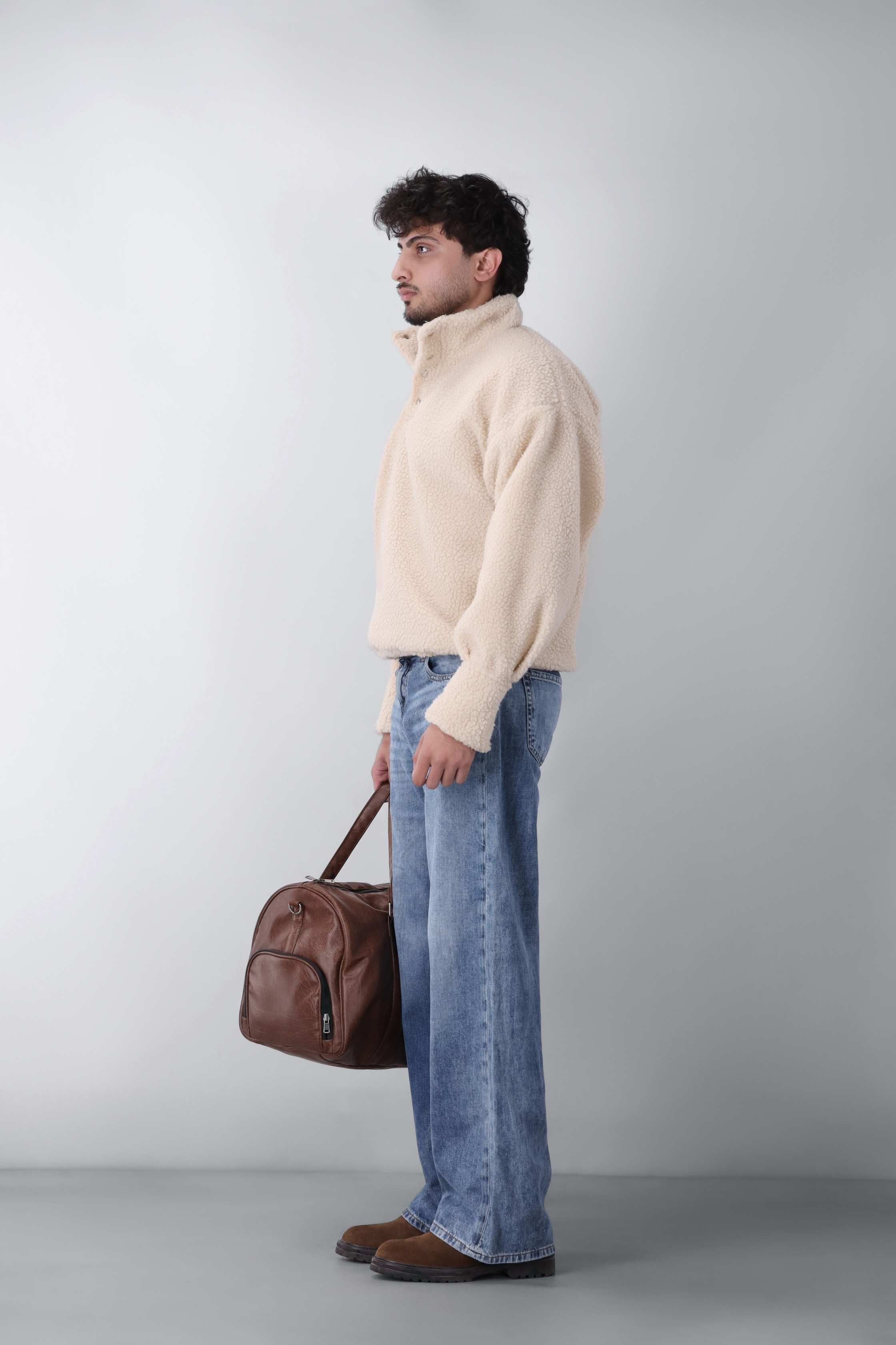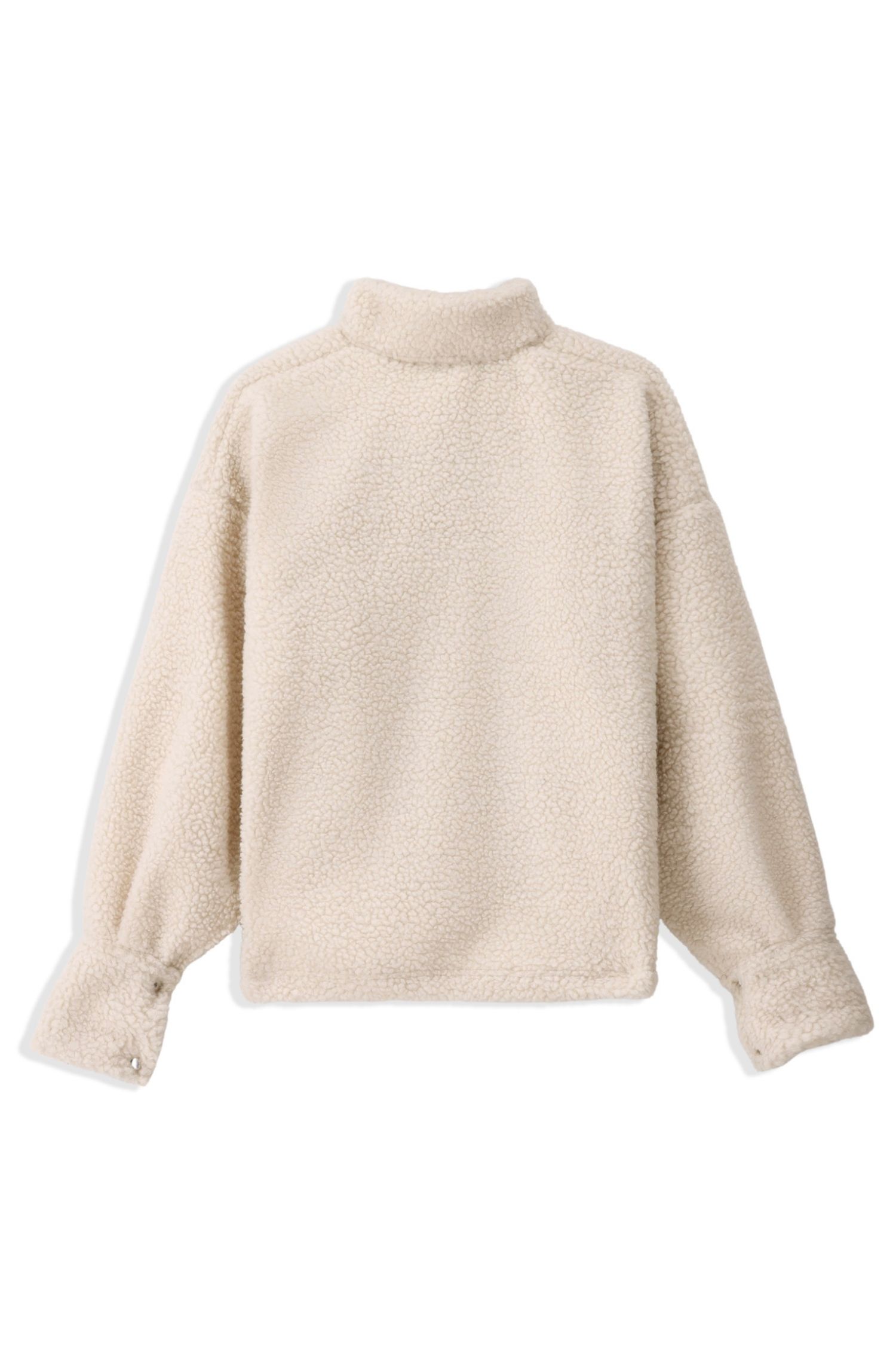 The back remains smooth and uninterrupted, allowing the depth and texture of the sherpa fabric to take focus. The adjustable hem provides controlled shaping from the rear, ensuring both comfort and structure in the overall silhouette.
