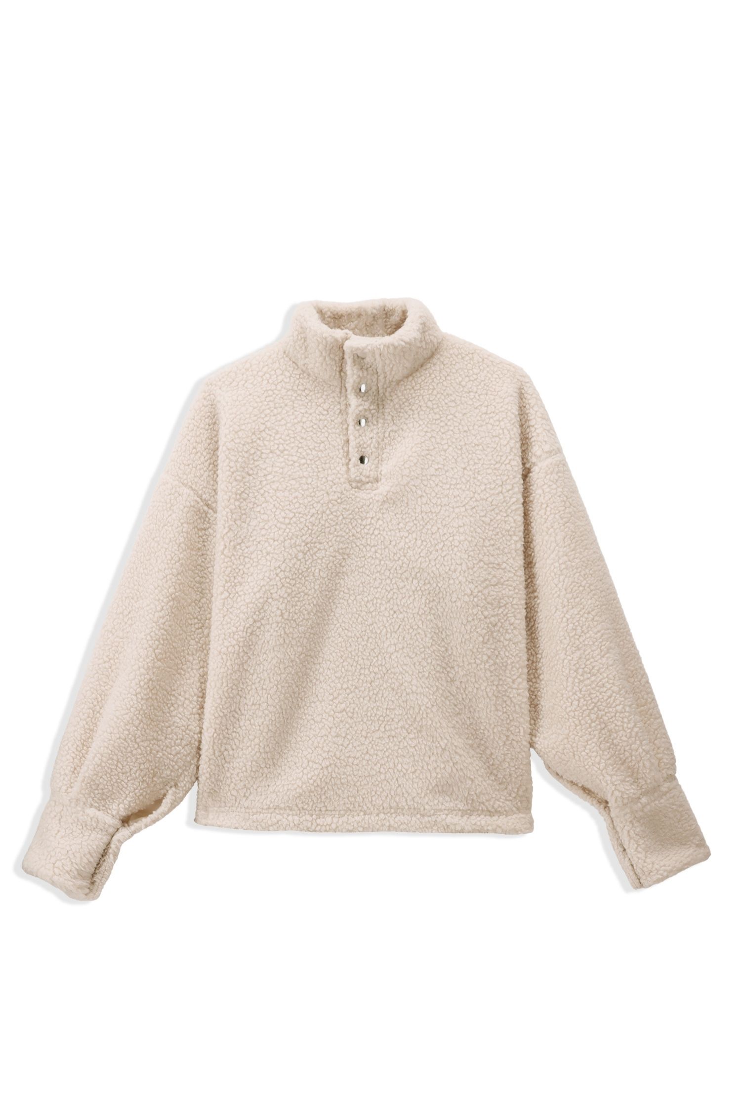 The front features a clean and composed structure highlighted by four black snap buttons running along the center. The high-neck stand collar frames the neckline with a strong, modern presence while maintaining minimal aesthetic balance.
