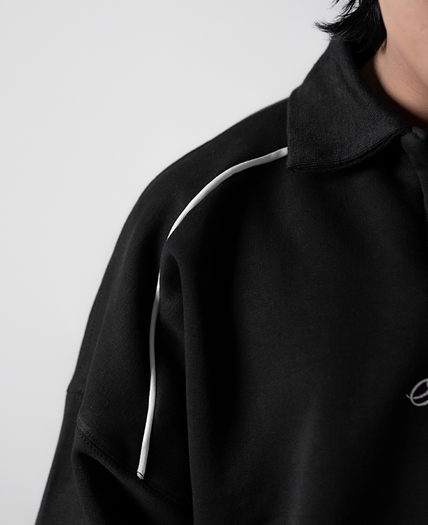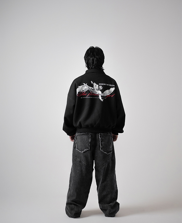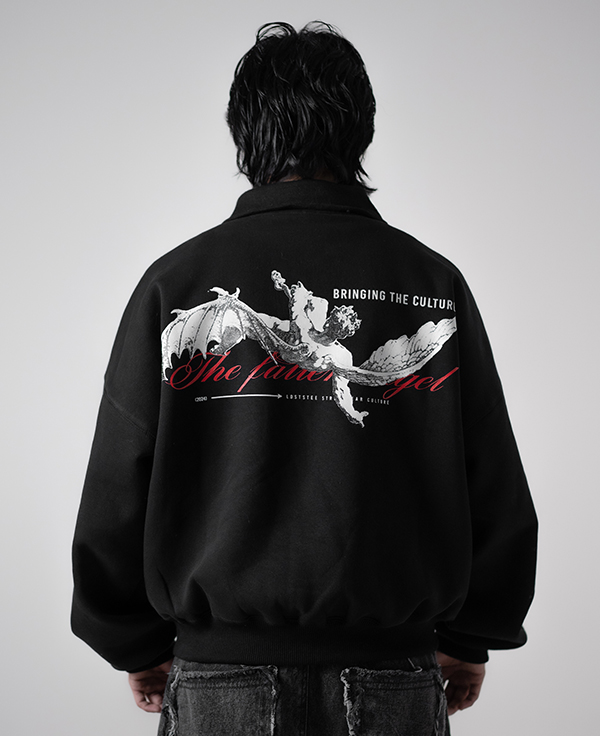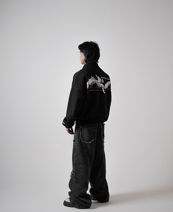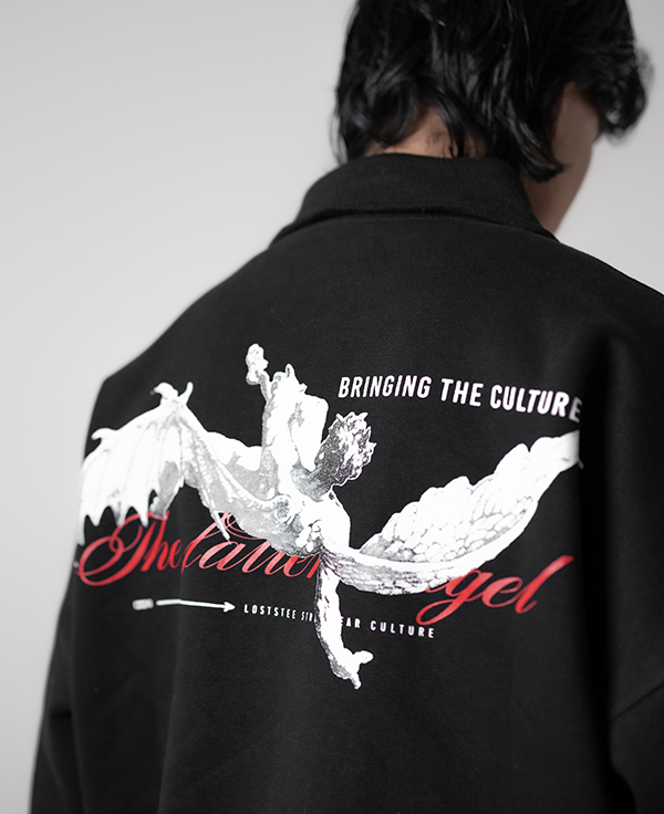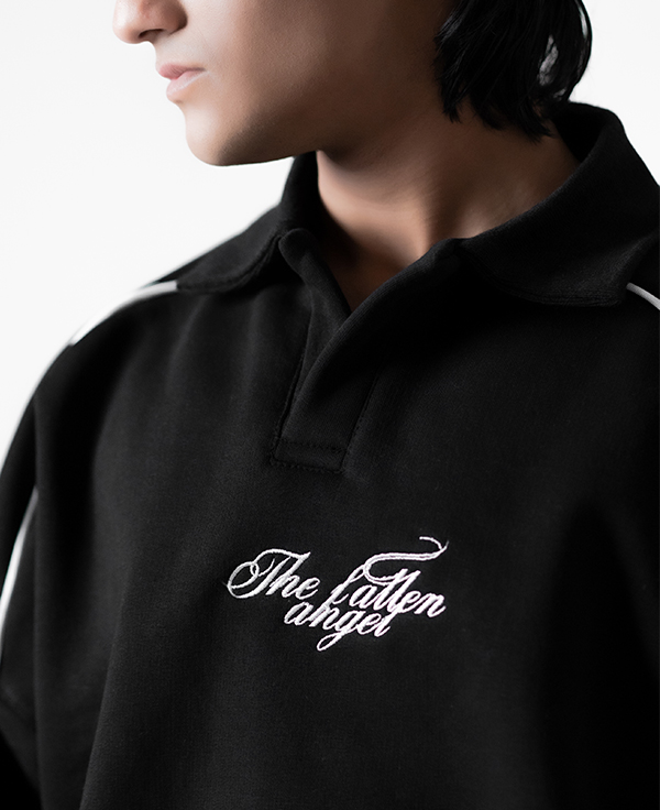 •Front Design: A cotton striped knit collar with a cut forming a V-notch shape, shoulder panels accented with contrast piping, and The Fallen Angel embroidery for a bold and unique touch.