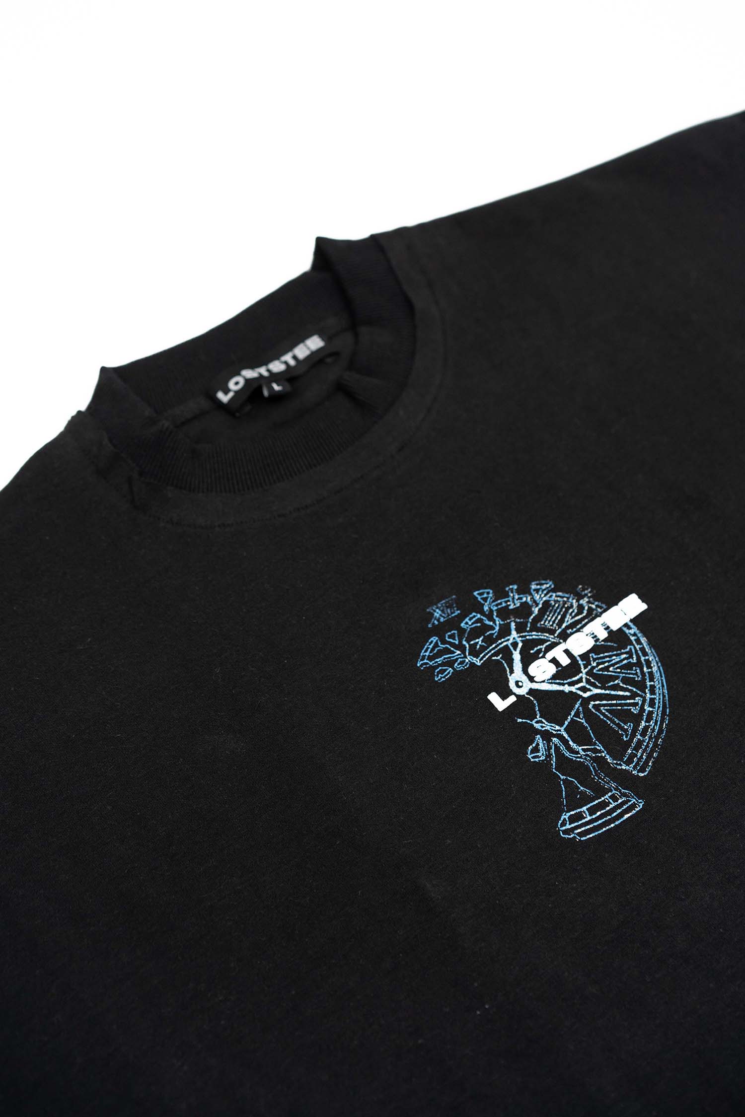 A striking visual featuring a half-broken watch in sky blue screen print, detailed with skin-toned sparkles. Layered over it sits the Loststee logo in bold white puff print, adding texture and depth to the design.