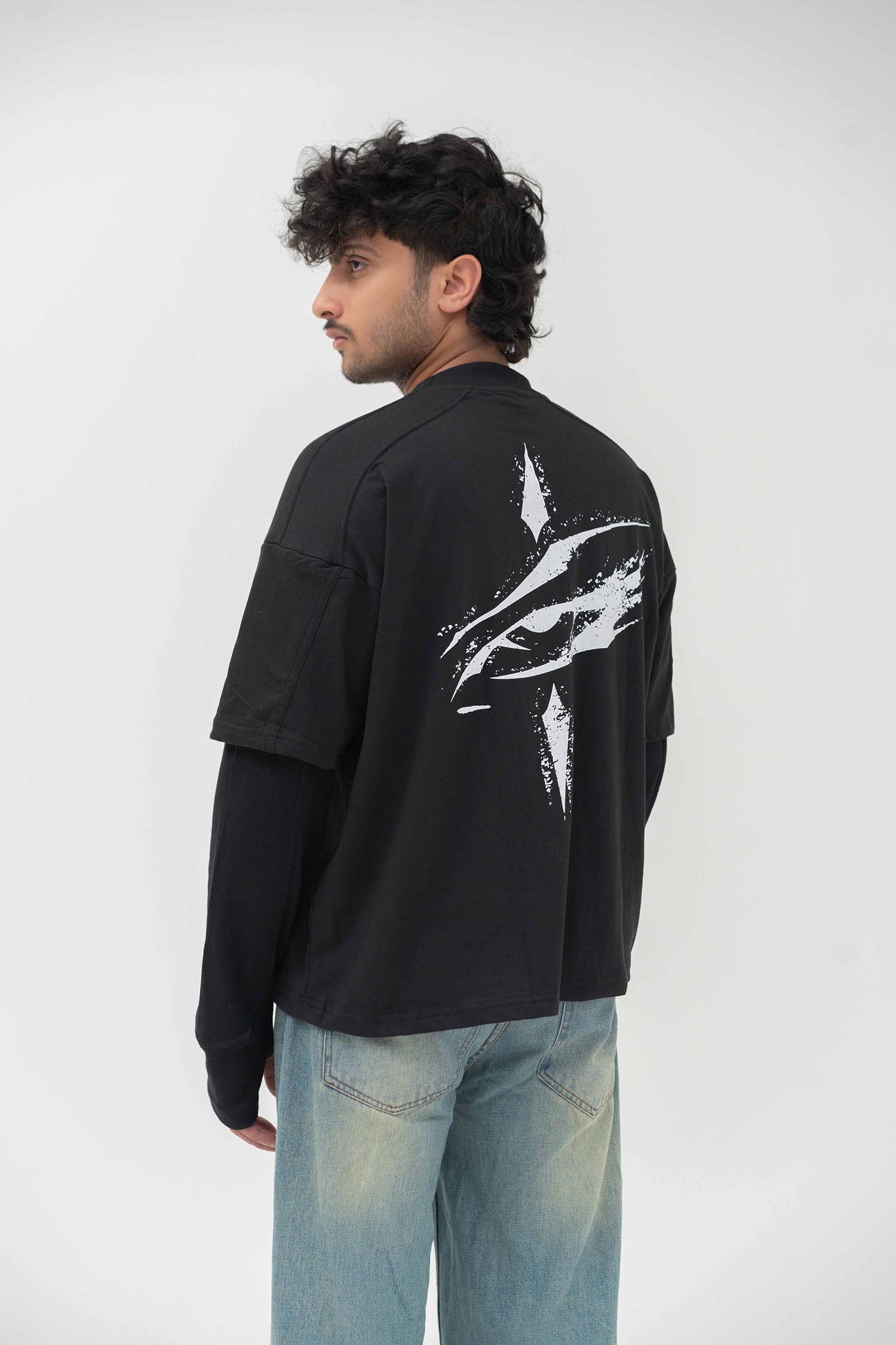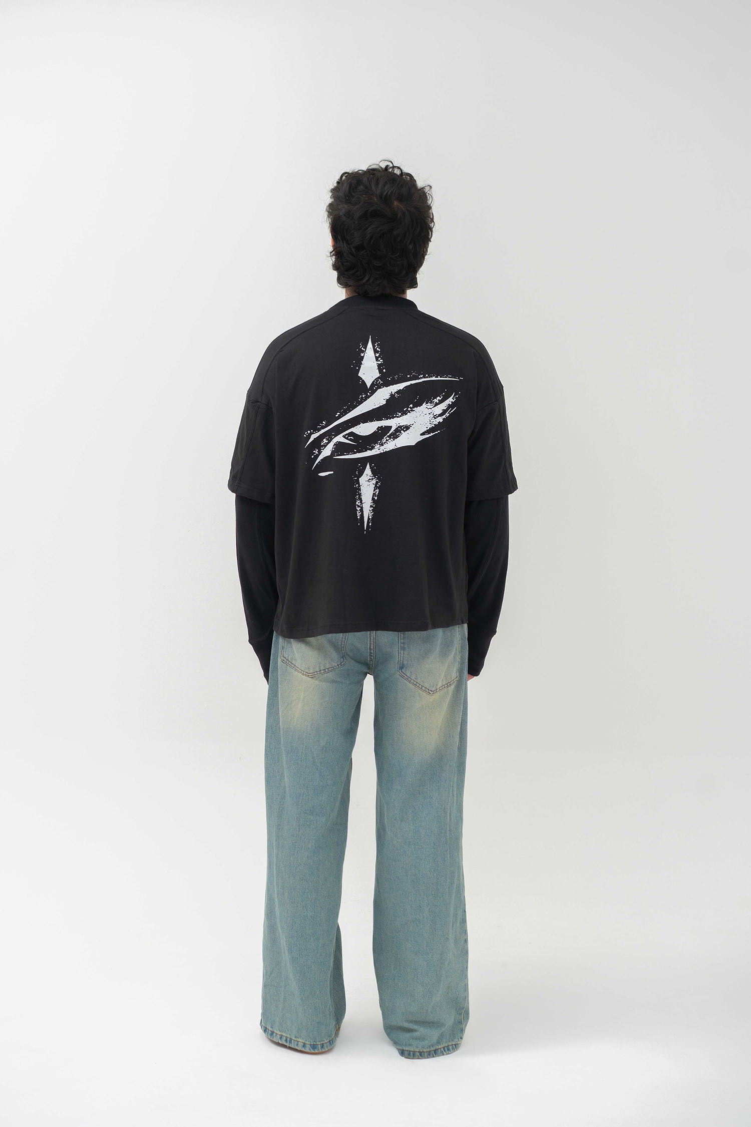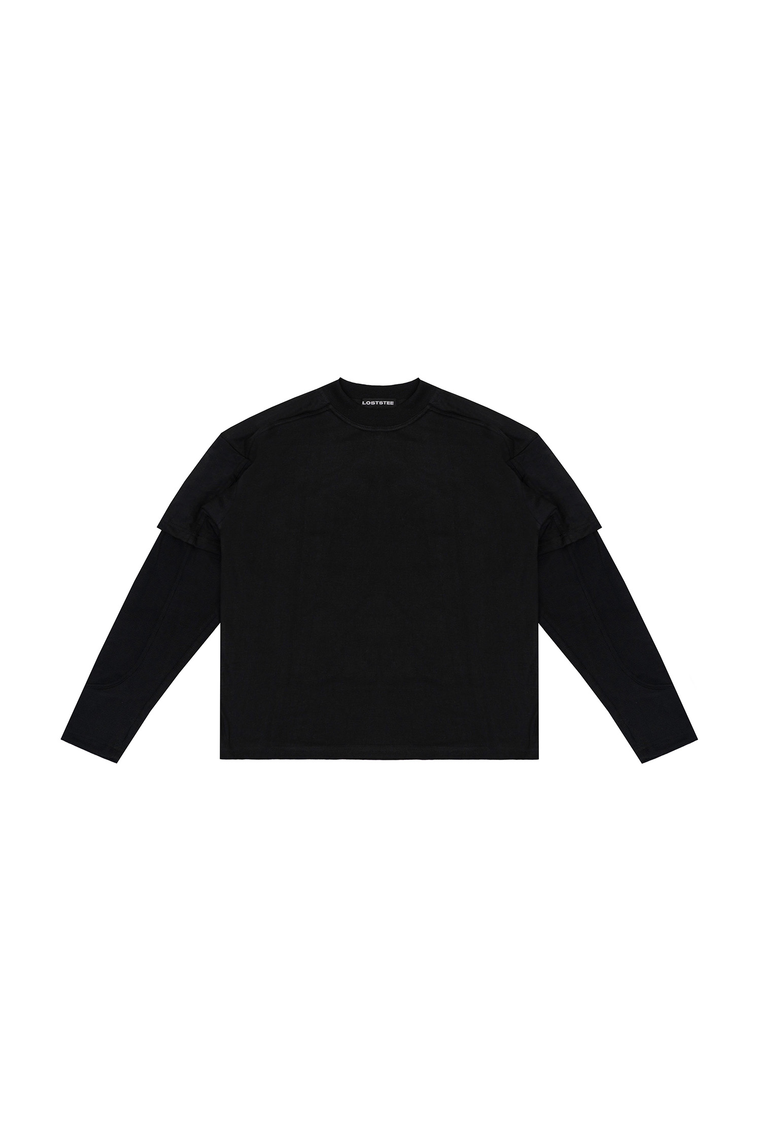 •Plain black cotton jersey base with three panels running from shoulder to halfway down each sleeve