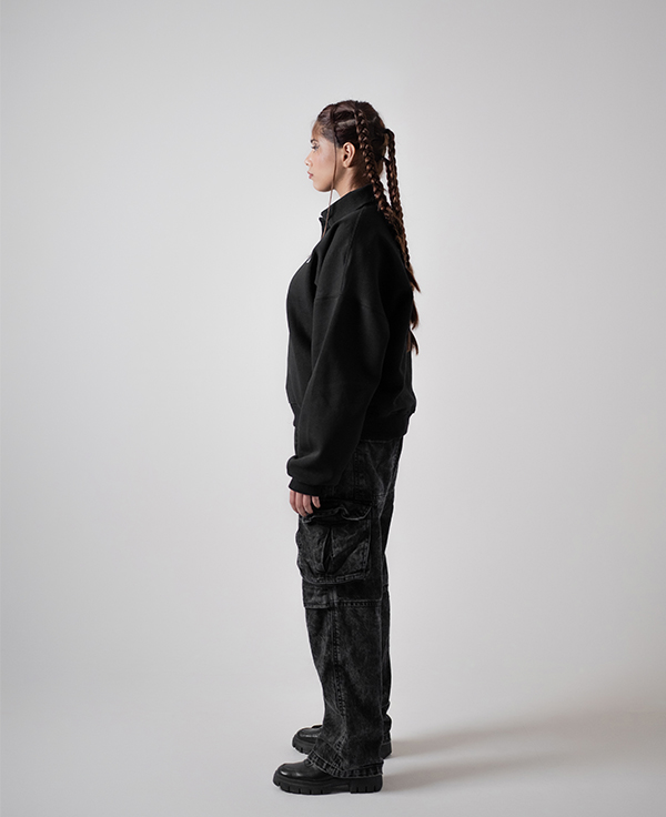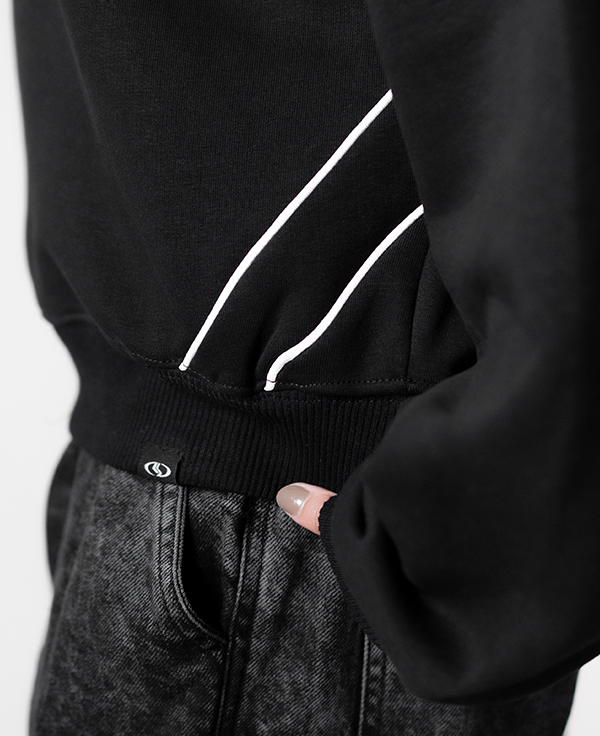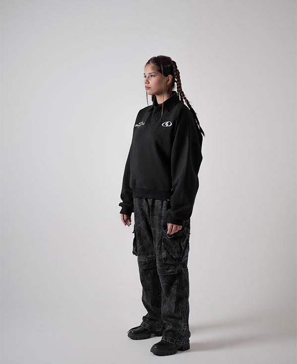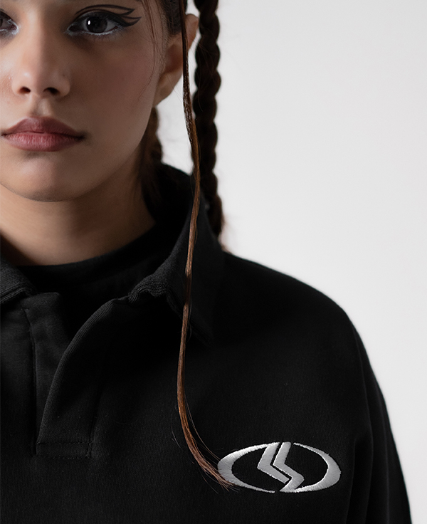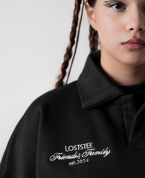 •Front Design: A cotton striped knit collar with a V-notch cut, Loststee Friends and Family ESTD 2024 embroidered on the right, and Loststee logo embroidery on the left.