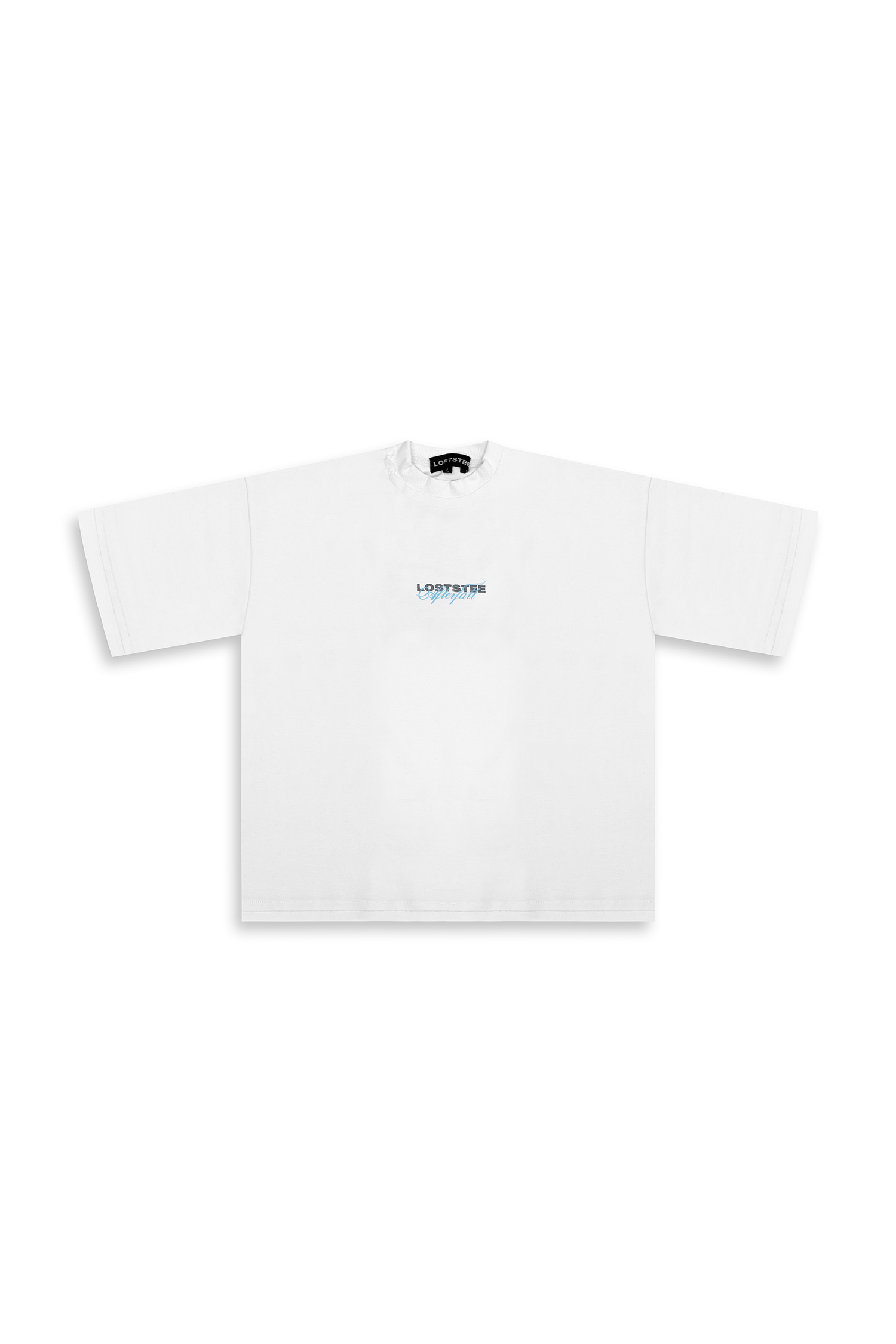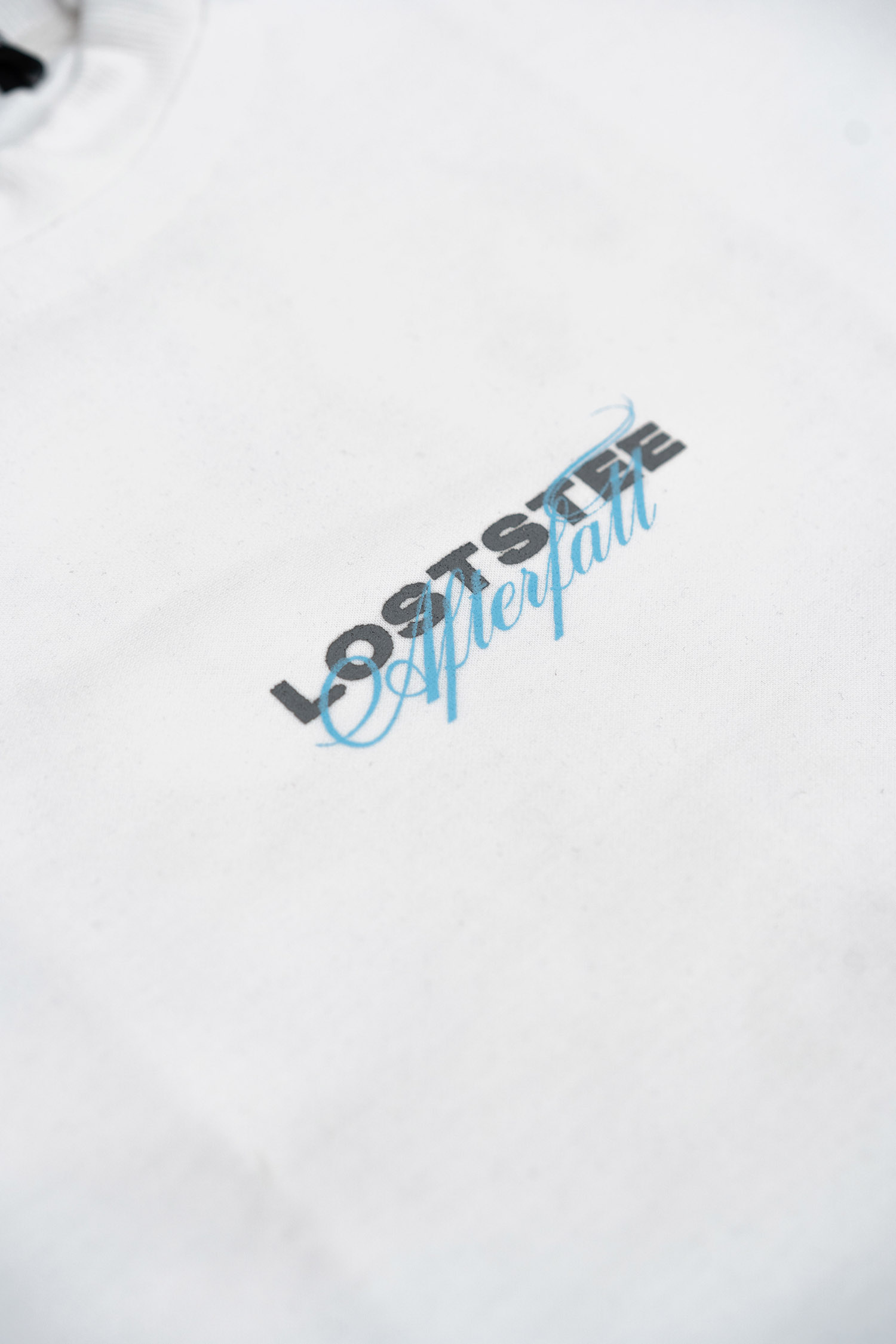 A clean aesthetic featuring a grey screen-printed Loststee logo paired with "Afterfall" in sky blue, printed boldly on the front.