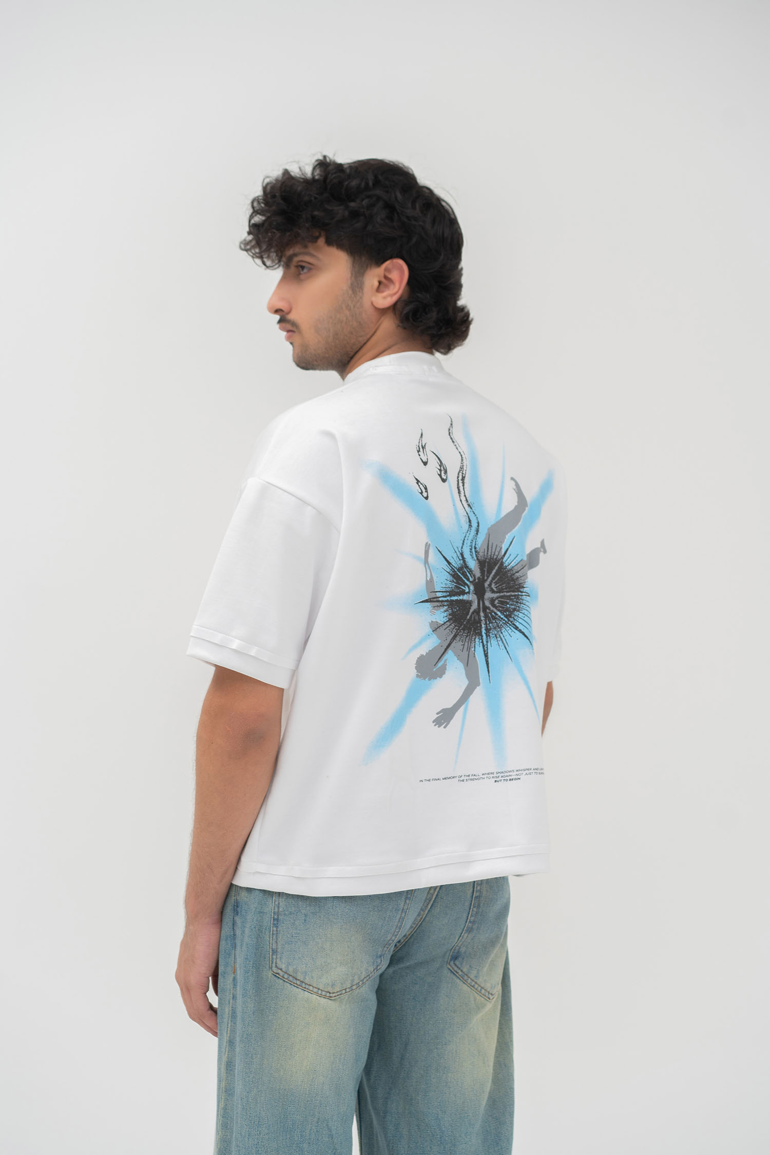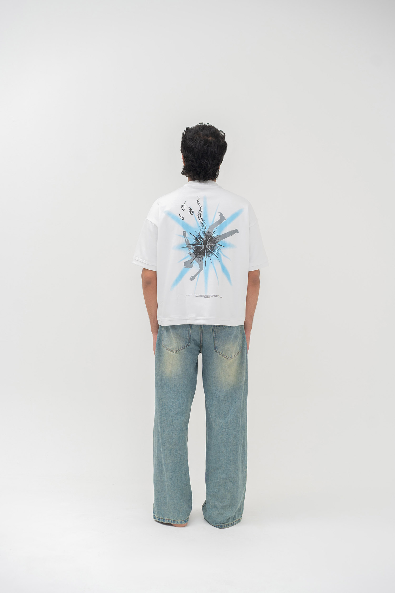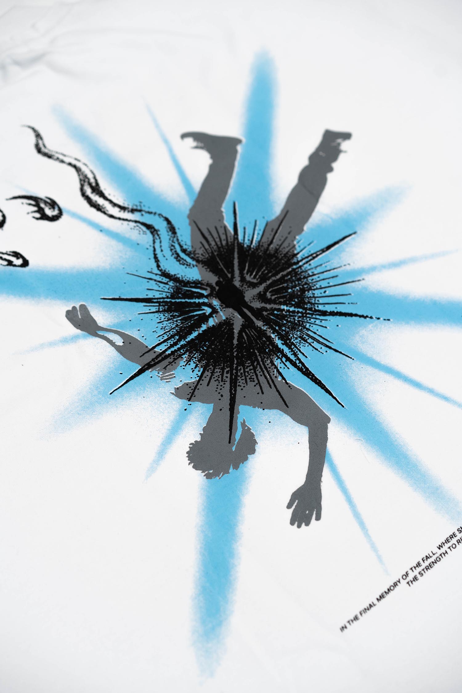A striking composition brought to life with a three-color screen print in sky, grey, and black, showcasing a falling character emerging from a burst of light. Below, black fire elements rise upward, surrounding a central character rendered in puff print, radiating from within. At the bottom, the story is sealed with a black screen-printed line: